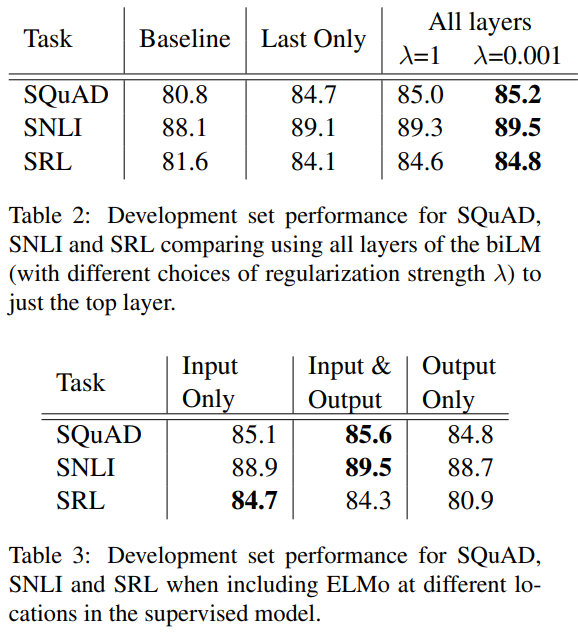 - 이러한 앞선 실험들은 biLM에서 모든 layer가 중요한 이유를 알려준다. 즉, 각 layer마다 잡아낼 수 있는 문맥 정보가 다르기 때문이다.