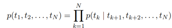 - N개의 토큰 시퀀스 (t1, t2,..., tN)가 있을 때, 순방향 언어 모델의 (t1, t2,..., tk-1)에 의해 주어진 tk의 확률에 의해 정해진다.
