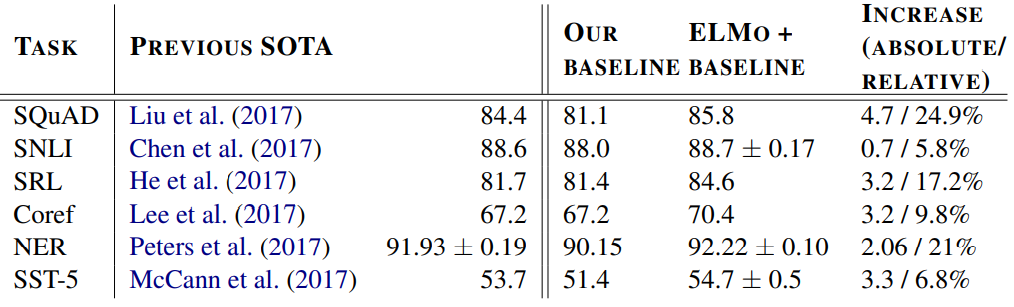 - 표 1은 6가지 NLP 작업의 다양한 set에 대해 ELMo의 성능을 보여준다. 모든 작업에서 ELMo를 추가하기만 하면, 기존의 모델 성능에 비해 6~20% 범위의 상대 오차가 감소함을 확인했다.