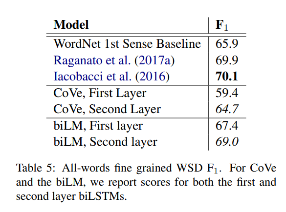 - 마지막 예로, 단어 문맥을 인코딩하기 위한 LSTM 최상위 계층은 단어 의미의 표현을 학습하는 것으로 나타났다.