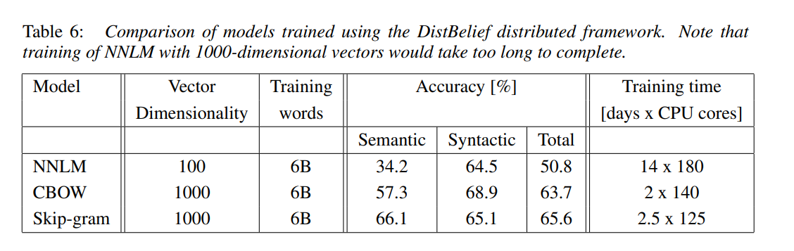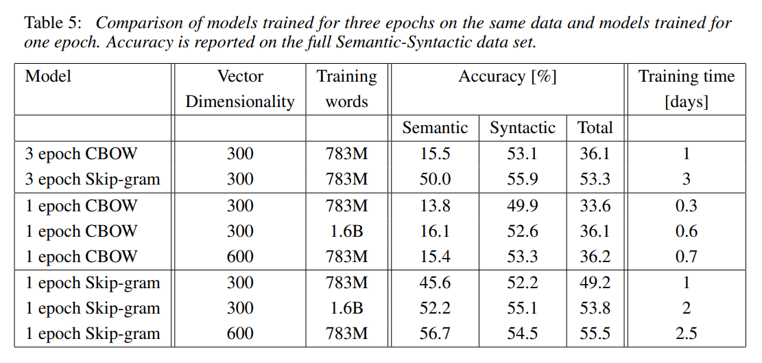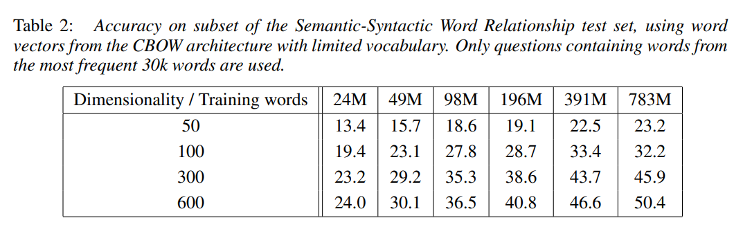 - 큰 데이터 셋과 큰 차원을 통해 훈련된 단어 벡터는 상당히 더 나은 수행을 보일 것이라 저자들은 예상한다.