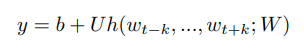 - yi는 각 output word i에 대해 로그 확률을 normalized하지 않은 값이다. U, b는 softmax 파라미터이며, h는 W로부터 추출된 단어 벡터들의 평균이거나 concatenate에 의해 만들어진 것이다.
