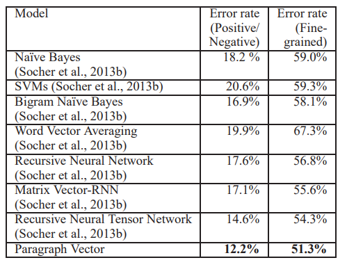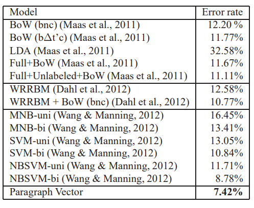 Results: 결과적으로 문단 벡터를 사용한 경우 다른 방법들 중 가장 우수했던 기존 모델에 비해서 1.3%의 개선이 있는 만큼 좋은 결과를 도출함을 알 수 있다. (상대적으로 15%의 개선)